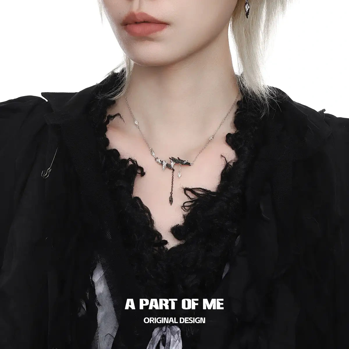 The feather wing pendant symbolizes freedom and elegance, elevated by the mix of platinum and black finishes. The layered tones and shimmering zircon details create a striking yet graceful centerpiece—perfect for bold, modern styling.