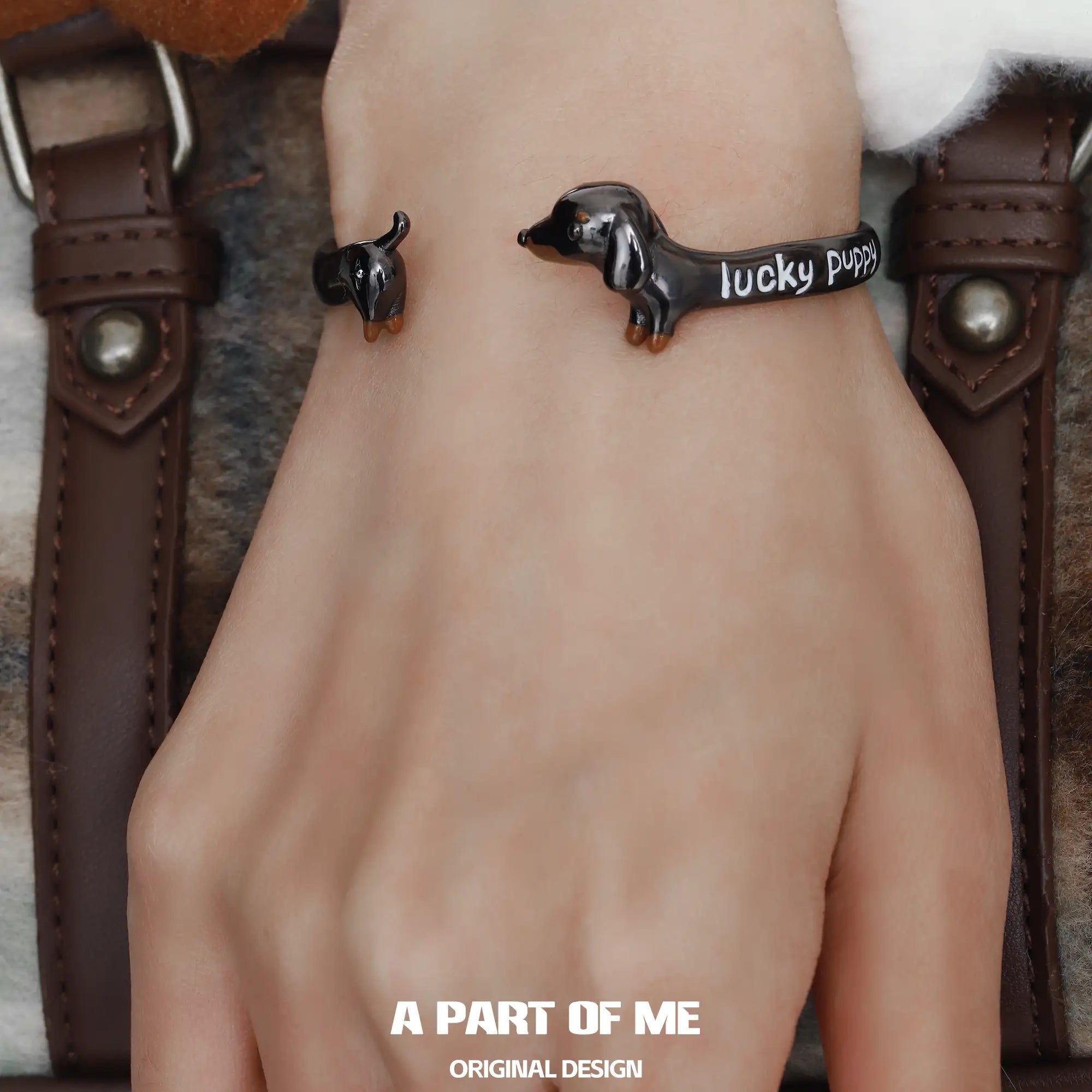 This bangle bracelet is made from durable brass, offering strong support for unique design shapes. It is plated with 18K black gold for a deep, polished finish that resists oxidation and remains gentle on the skin. The sausage dog figure is accented with high-grade hand-applied resin for added character and color.