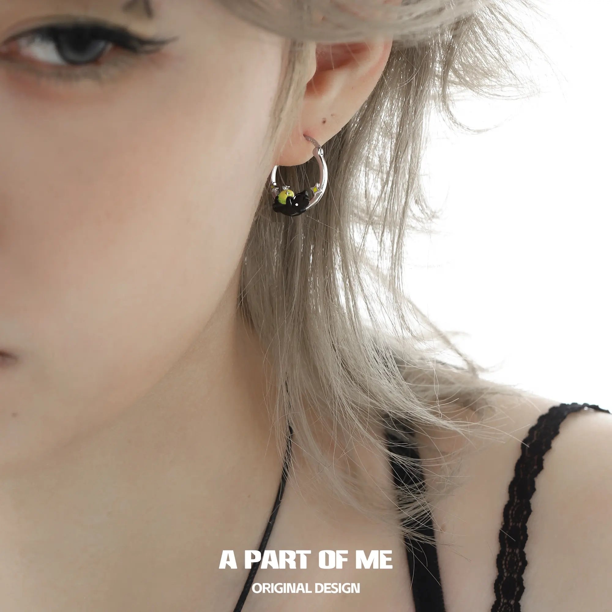 여름의 과일 향과 검은 고양이의 상징적인 우아함에서 영감을 받은 이 후프 귀걸이는 귀엽고 시크한 미학을 모두 담아냈습니다. 손으로 그린 에나멜 고양이 디테일이 사랑스러운 분위기를 더해 어떤 자리에도 잘 어울리는 기발하면서도 세련된 액세서리입니다.