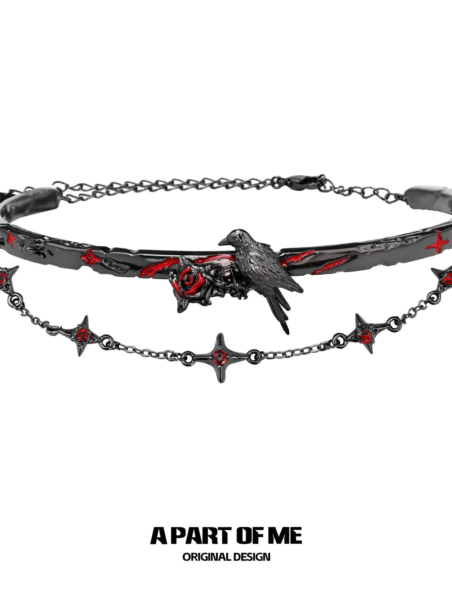 โชกเกอร์คู่นี้ผสานความงามแบบเข้มเข้ากับสีแดงเลือดหมูที่ตัดกันอย่างโดดเด่น โดดเด่นด้วยรูปทรงเรียบง่ายและสีสันจัดจ้าน เหมาะสำหรับสวมทับหรือใส่เดี่ยวๆ เพื่อสร้างเอกลักษณ์ให้กับสไตล์โกธิคหรือแฟชั่นอัลเทอร์เนทีฟ