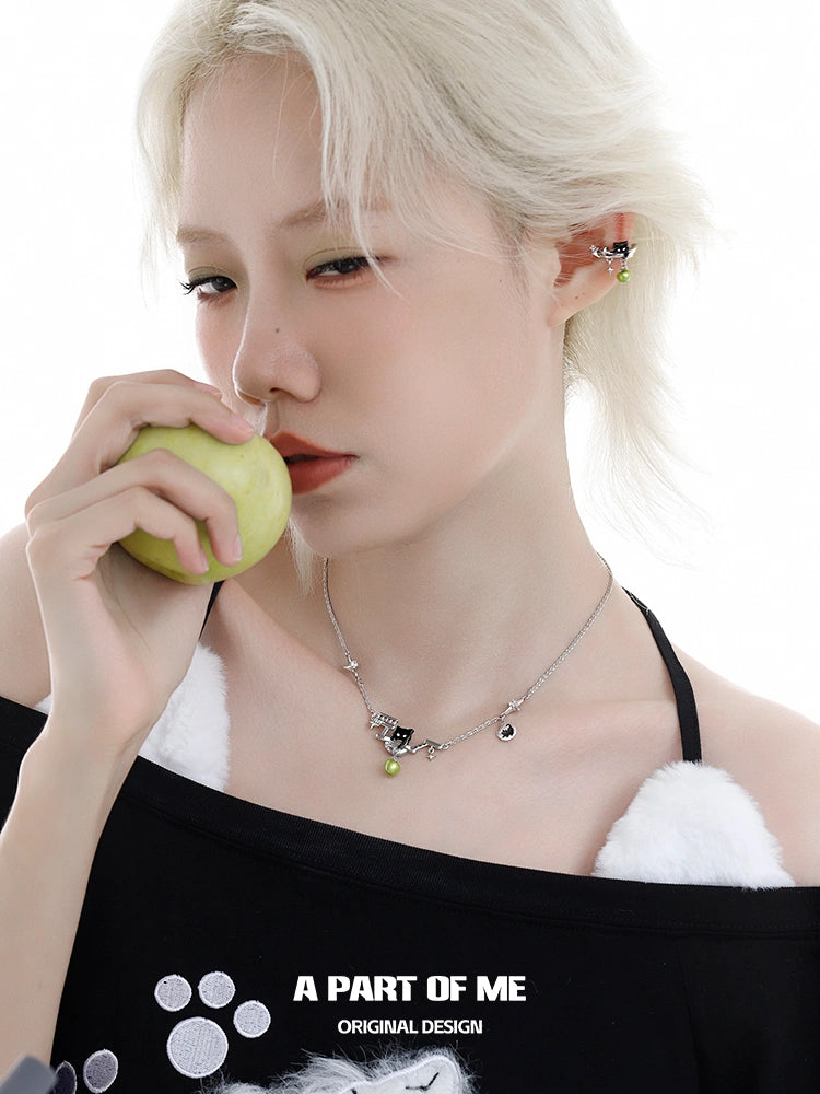 สร้อยคอโชกเกอร์เส้นนี้ผสมผสานรูปลูกแมวสีดำขี้เล่นเข้ากับรูปแอปเปิ้ลเขียวฉ่ำๆ ให้ความรู้สึกสดชื่นและสนุกสนาน ลวดลายเรซินสดใสและลวดลายแปลกตาทำให้เป็นเครื่องประดับที่โดดเด่น เหมาะสำหรับการเพิ่มความโดดเด่นและความสง่างามแบบสบายๆ ให้กับลุคฤดูร้อนของคุณ