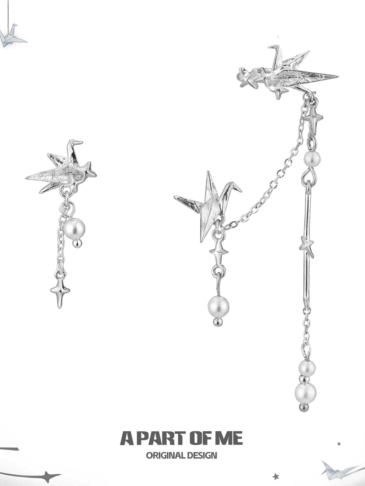 This asymmetrical set is crafted from high-quality brass with a brilliant platinum plating. The ear stud is completed with an S925 sterling silver post for comfort and safety, while delicate pearls add a graceful luster that enhances the paper crane's elegance.