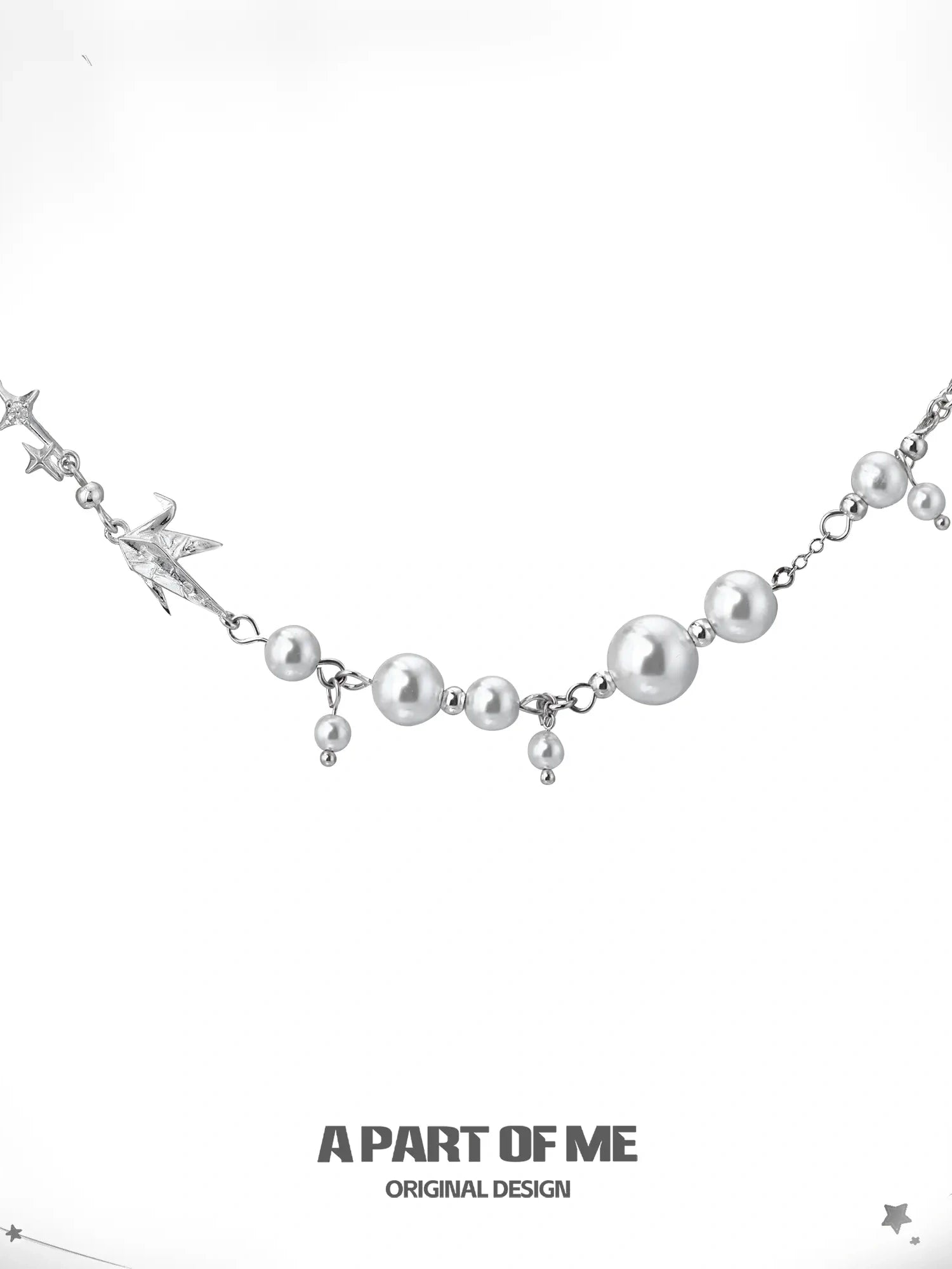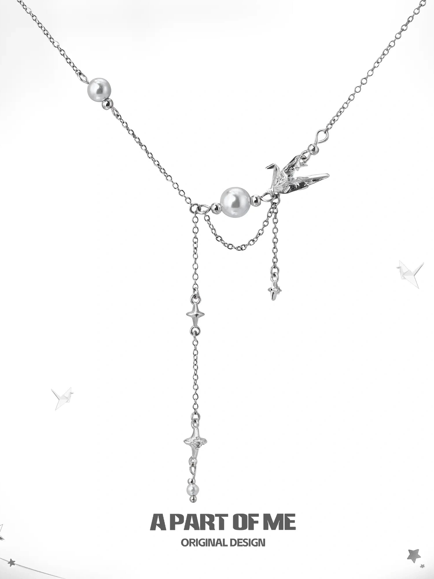 This layered necklace is crafted from premium brass with a luminous platinum plating. Embellished with shimmering zircon stones and elegant shell pearls, it offers a soft, refined glow that beautifully complements the folded crane silhouette.