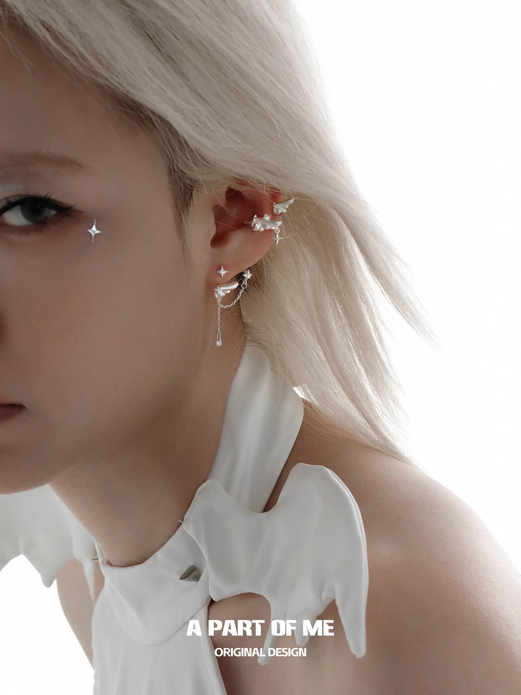 A magical addition to the “Immaculate Dream” collection, these ear cuffs depict an enchanting fairy figure gently hugging the ear. The sculptural form adds a sense of movement and story, perfect for those who seek accessories that feel like wearable fantasy. Whether paired or worn solo, they invite a touch of whimsy to any look.