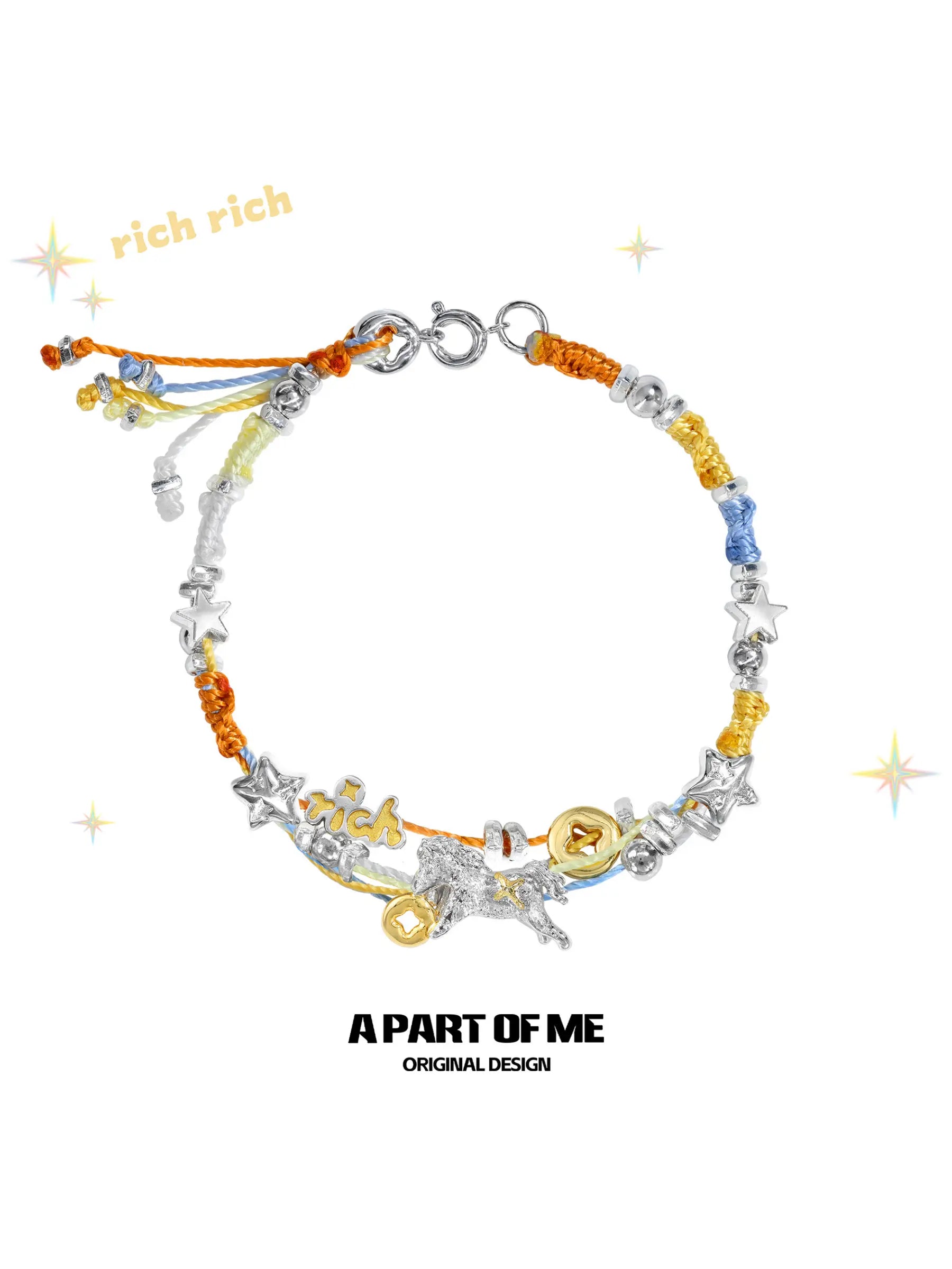 Part of the “Rich Horse” collection, this bracelet blends colorful woven craftsmanship with symbolic metallic accents. The rainbow cord represents energy, movement, and individuality, while the detailed gold elements add a sense of fortune and bold style—perfect for those who embrace vibrant expression.